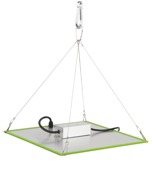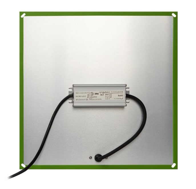 Печатная плата работает в дефорсированном режиме, ток на светодиодах уменьшен от номинального в два раза, в связи с этим удается достичь заявленной эффективности в 2 мкмоль/Вт*с. Квантум борд оснащен тросовой системой подвеса, вилкой на проводе длинной 1,5 м и выключателем.