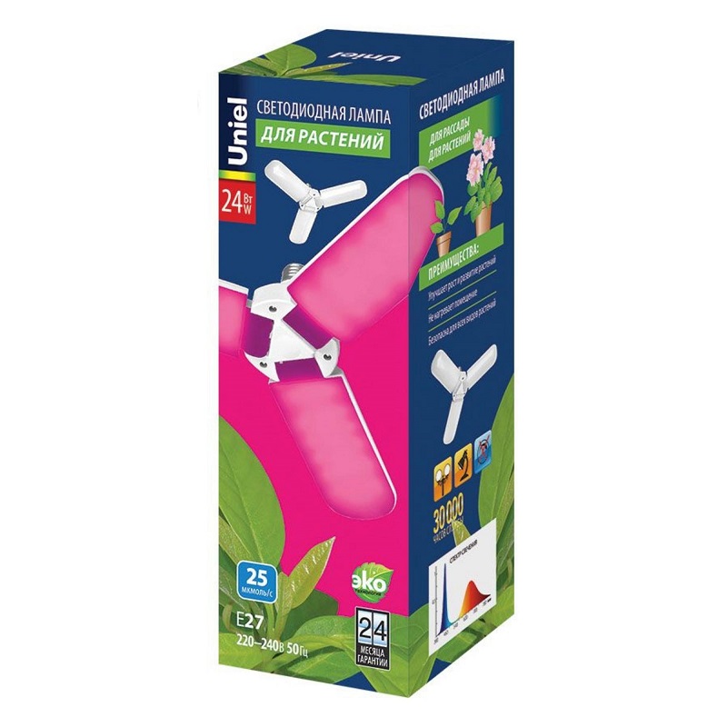 Трёхлепестковая светодиодная фитолампа LED-P65-24W/SPSB/E27/FR/P3 PLP32WH ТМ Uniel со специальным красно-синим спектром разработана специально для досветки рассады, черенков и растений в фазе цветения, укрепляя и стимулируя их рост.Угол рассеивания лампы составляет 180º и позволяет осветить большую площадь. Её лепестки можно зафиксировать в 3-х различных положениях, чтобы сформировать световой пучок нужного объема. Лампа имеет стандартный цоколь Е27, высокую степень защиты, долгий срок службы (30 000 ч) и низкое электропотребление.