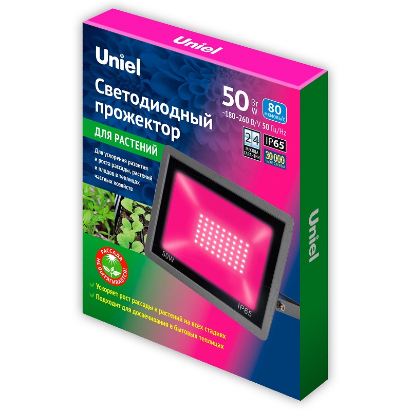 Прожектор компенсирует недостаток красной и синей составляющих спектра, требующихся для фотосинтеза. Прожектор изготовлен из алюминиевого справа, цвет корпуса - черный. Мощность - 50 Вт. Благодаря высокоэффективным светодиодам, прожектор не нагревает воздух. Фитопрожектор Uniel выдает плотный световой поток с углом рассевания в 120º и качественно освещает большую площадь.