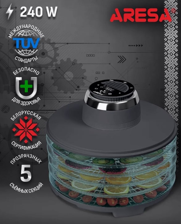 Сушилка для овощей и фруктов ARESA AR-2605 - прибор который соответствует всем сертификационным нормам.Мощность устройства 240 Вт. Встроенный конвекционный вентилятор с высокопроизводительным двигателем постоянного тока в 6 Вт поможет сократить время равномерной сушки овощей и фруктов. Корпус сушилки AR-2605 изготовлен из высококачественного термостойкого пластика, он не выделяет вредных веществ в продукты. Устройство оснащено 5 прозрачными съемными секциями для сушки. Сушилка оснащена возможностью регулировки температуру от 35 до 70 градусов, с помощью чего Вы сможете настроить необходимую температуры под любой продукт, сохранив при этом все его полезные свойства.