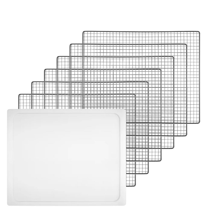 Сушилка имеет в комплекте 6 поддонов для сушки и 1 поддон для жидкости. Поддоны для сушки выполнены из нержавеющей стали.