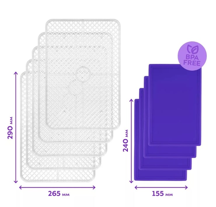 В комплекте идут 6 металлических сетчатых поддонов для сушки фруктов, овощей, мяса; 6 пластиковых сетчатых поддонов для сушки небольших продуктов; 6 пластиковых сплошных поддонов для сушки водянистых продуктов и приготовления пастилы.