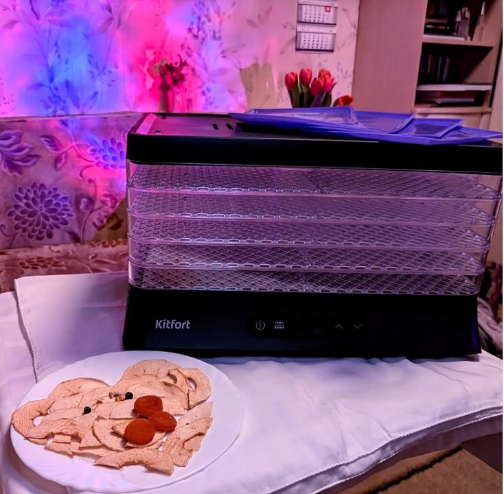 Вместительная сушилка Kitfort КТ-1964 сохранит любимые фрукты и овощи полезными круглый год! Она насушит на всю зиму мясо, рыбу, помидоры, клубнику, персики, грибы, зелень, хлеб, а с помощью сплошных поддонов можно приготовить и пастилу.Сушилка оборудована большим мощным вентилятором, что обеспечивает равномерный горизонтальный обдув всех поддонов. Поток воздуха направлен горизонтально, поэтому запахи продуктов с разных поддонов не смешиваются.