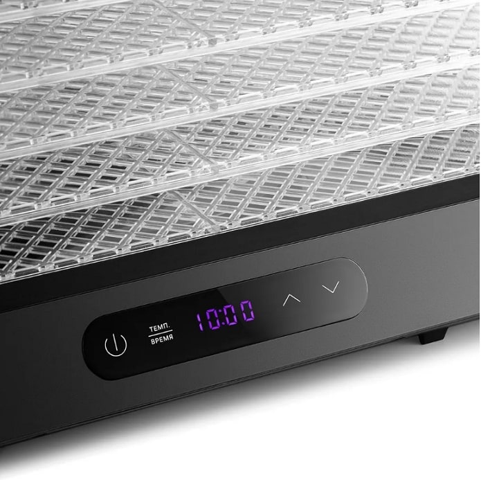 На сушилке можно устанавливать температуру сушки в диапазоне 35-75°C с шагом 5 градусов. Сушилка также оснащена таймером до 24 часов с шагом 30 минут. Для вашего удобства необходимые время и температуру сушки различных продуктов указаны в инструкции.