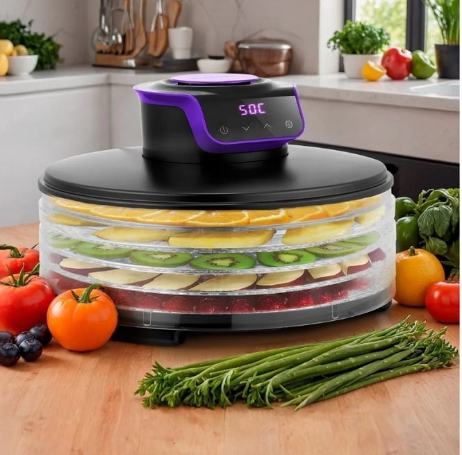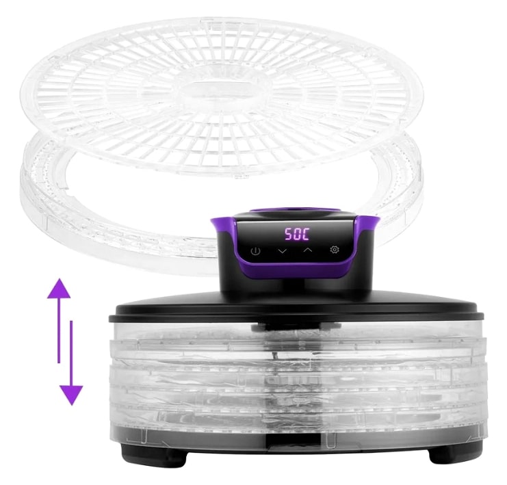 Регулируйте расстояние между поддонами, устанавливая каждый следующий поддон выступами на пазы нижнего. 4 пластиковых поддона оснащены съёмным дном для удобной сушки объёмных продуктов.