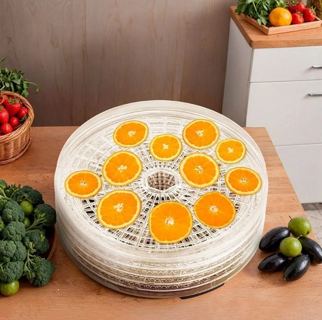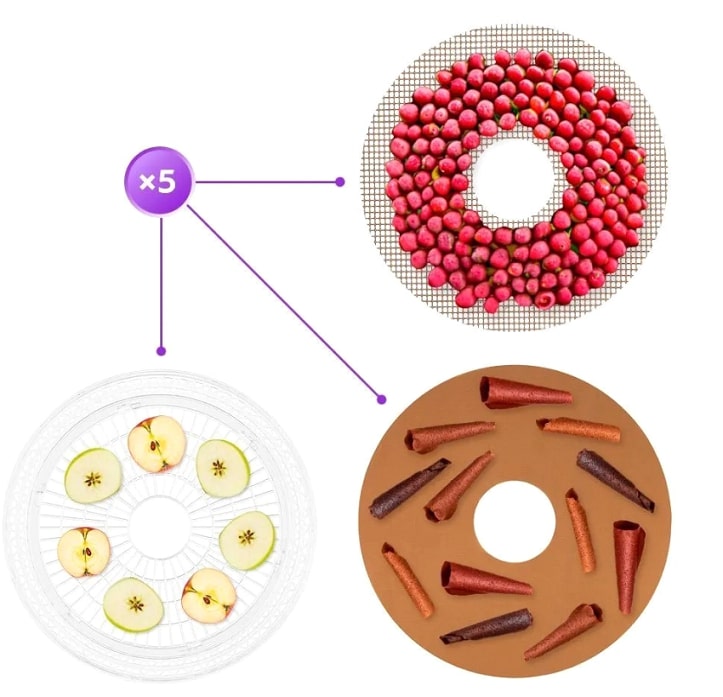 Сушилка имеет в комплекте 5 поддонов из пластика, 5 сеток для более мелких продуктов и 5 поддонов для пастилы. Идеальный набор для сушки разных видов продуктов!