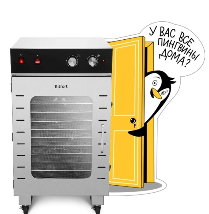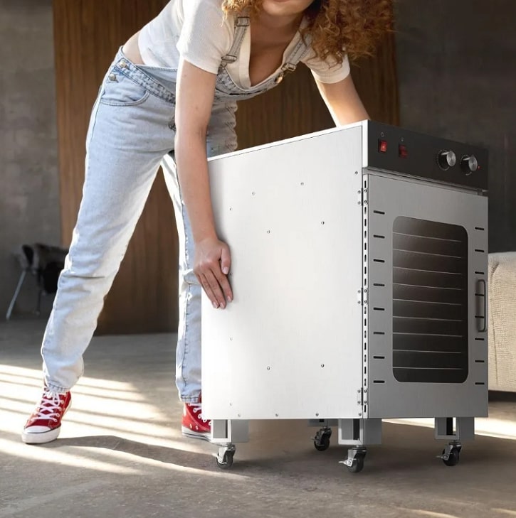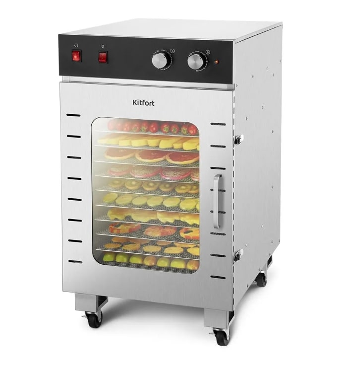 На электрической сушилке для овощей и фруктов КТ-4928 предусмотрены колёса для перемещения. При помощи них будет облегчён перемещение в другую комнату, перевоз устройства из загорода в город, что является довольно частой практикой в период жаркого сезона.
