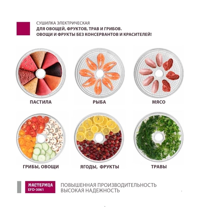 - Продукты для сушки: пастила, фрукты, овощи, зелень, лечебные травы, ягоды, мясо, рыба, грибы, хлеб