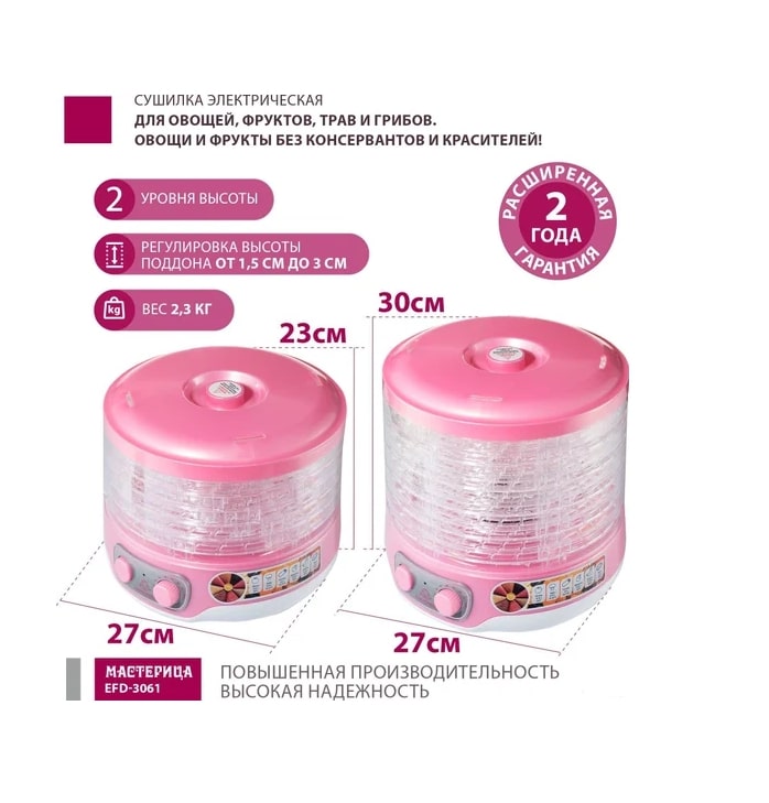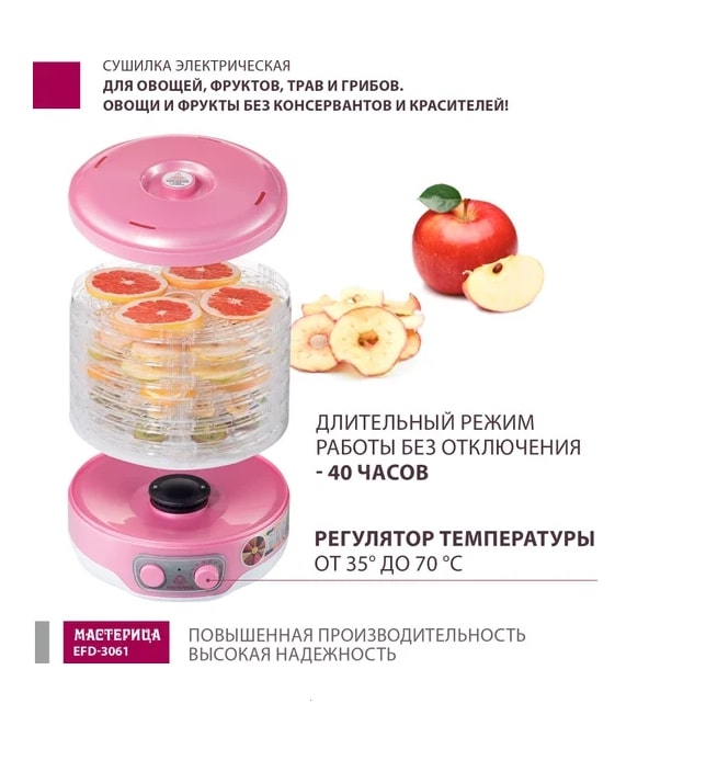 Сушилка Мастерица EFD-3061 идеально подходит для заготовки сухофруктов, овощей и трав в домашних условиях. Позволяет сохранить максимум витаминов и полезных веществ в ваших продуктах. Простая в использовании и обеспечивает равномерную сушку. Подходит для приготовления полезных снеков и десертов. Теперь запасы на зиму станут проще и вкуснее!Преимущество: