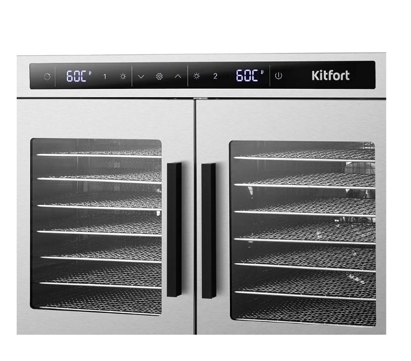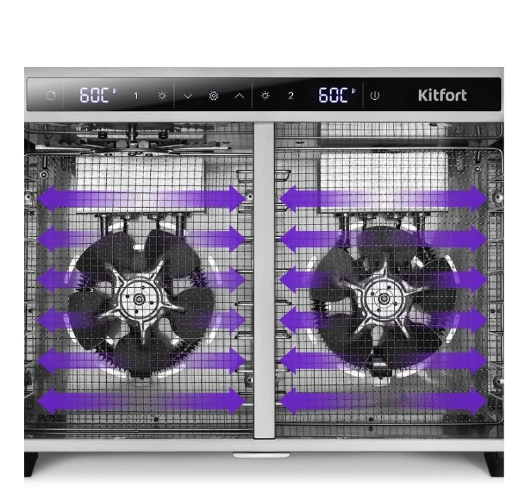 Электрическая сушилка КТ-4936 предназначена для сушки овощей, фруктов, ягод, грибов, корнеплодов, трав и зелени, а также мяса и рыбы, хлеба. Сушилка имеет две независимые камеры, в каждую из которых может быть установлено по 8 металлических поддонов.В сушилку установлены мощные нагревательные элементы и два вентилятора, обеспечивающих равномерное распределение воздуха по всему объёму камер. Благодаря горизонтальному обдуву смешение запахов при одновременной сушке разных продуктов минимально.