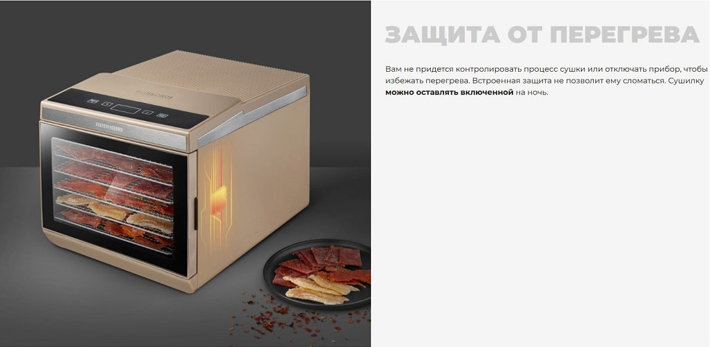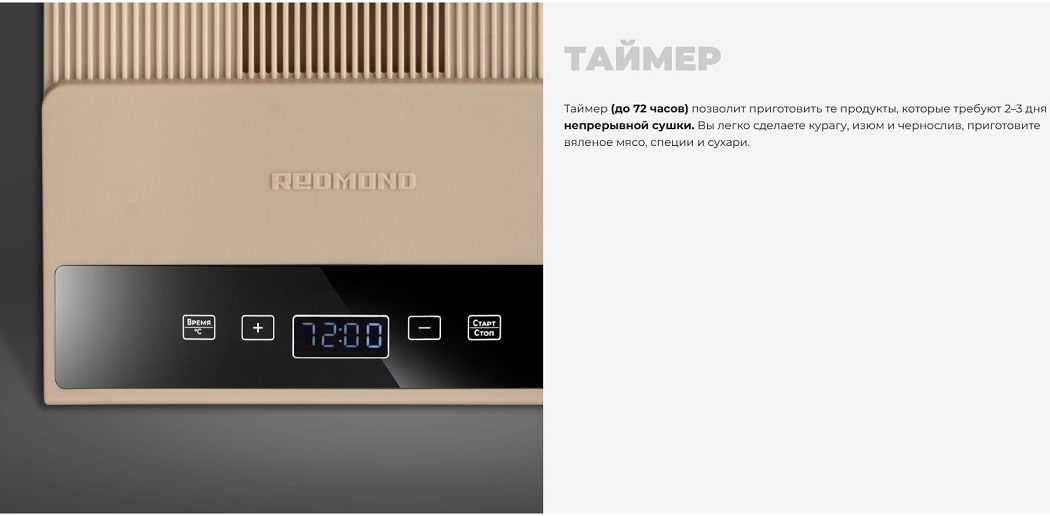 Высушивание разных продуктов требует разного времени в зависимости от их сочности, мягкости, твердости кожуры, волокнистости и других качеств. Таймер на 72 часа с шагом 0,5 часа позволит сделать курагу, изюм, чернослив и другие сухофрукты, завялить мясо, приготовить приправы и пастилу.