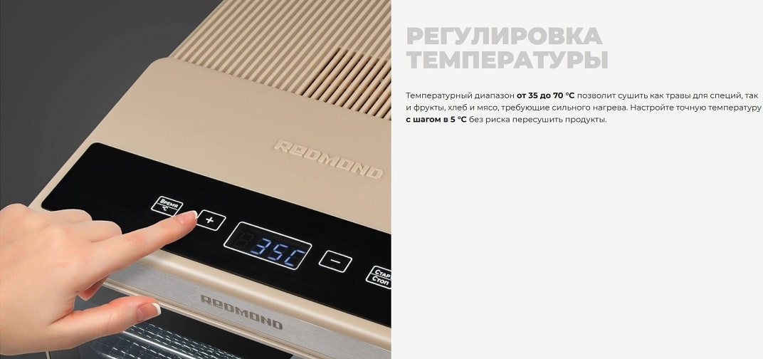 Установите температуру от 35 до 70 °C с шагом 5 °C, чтобы приготовить разнообразные закуски и снеки. Широкий температурный диапазон позволит высушить и завялить разнообразные продукты — как те, которые нужно долго обрабатывать горячим воздухом, так и которые нужно подсушить совсем немного.