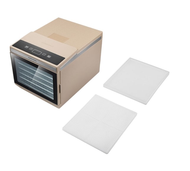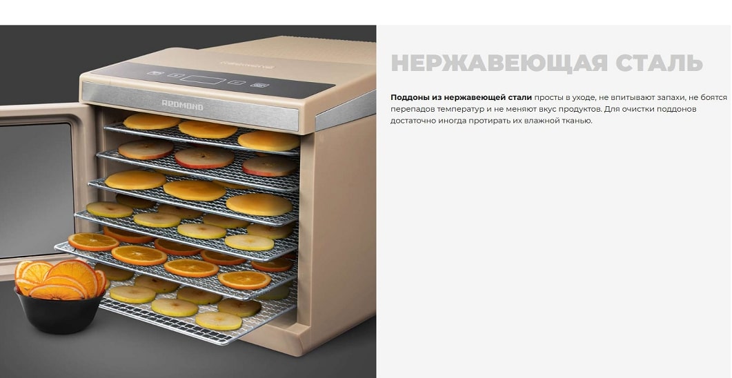 Внутри сушилки 6 ярусов с отверстиями — на них сушат кусочки овощей и фруктов, грибы, мясо, ломтики хлеба. Кроме этого в комплекте 2 вида поддонов: