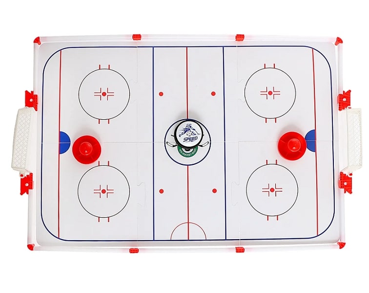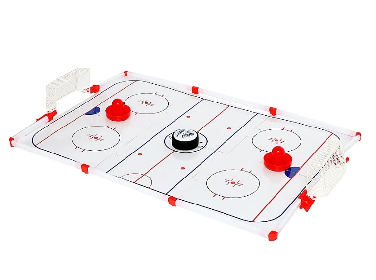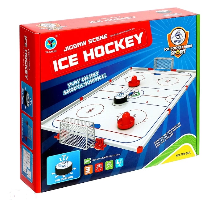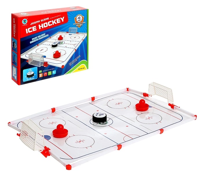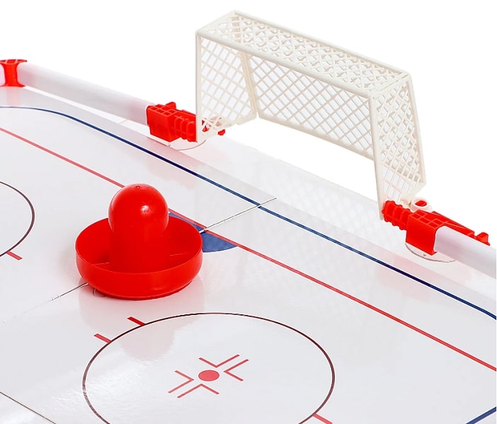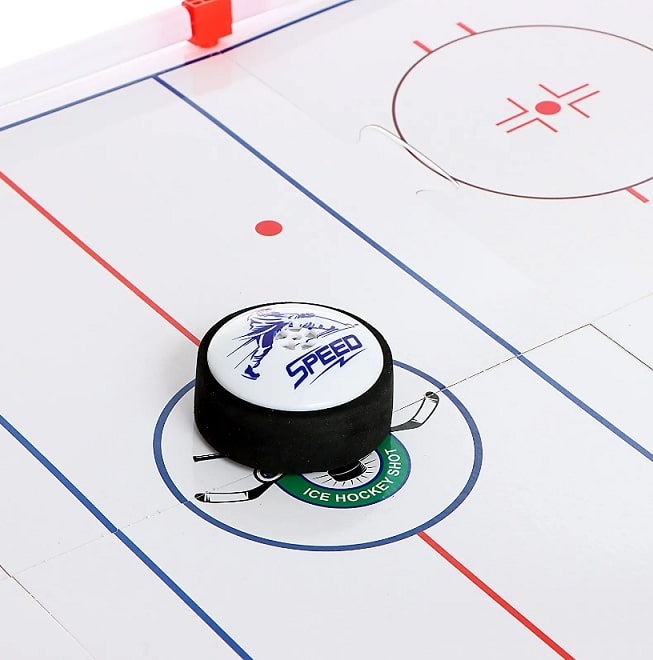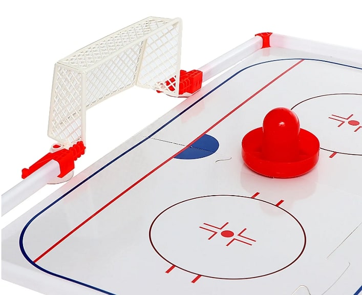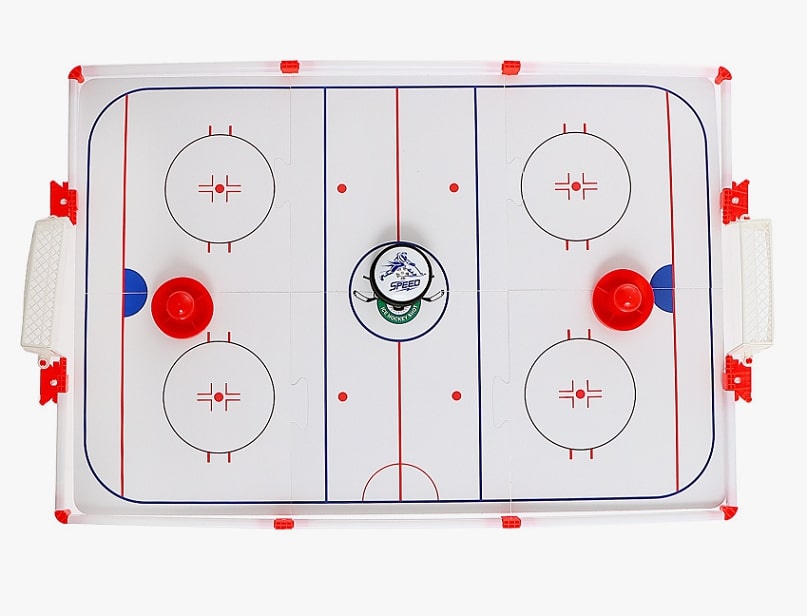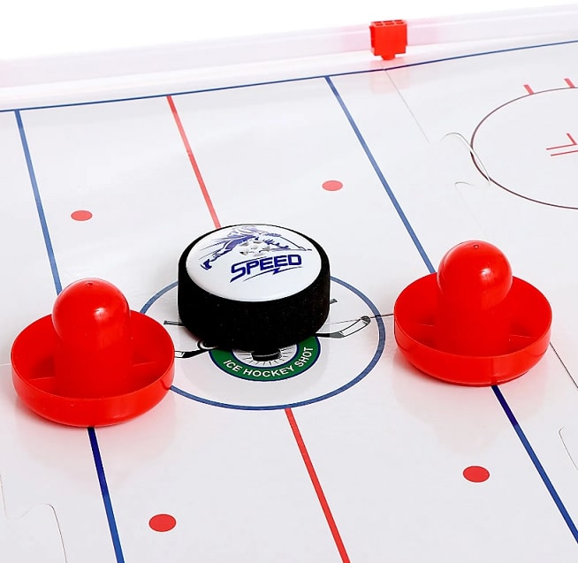 Она имеет комплектацию в виде биты и шайбы, а также механический счетчик для отслеживания результатов игры.Игровое поле покрыто пластиком, что обеспечивает плавное движение шайбы.