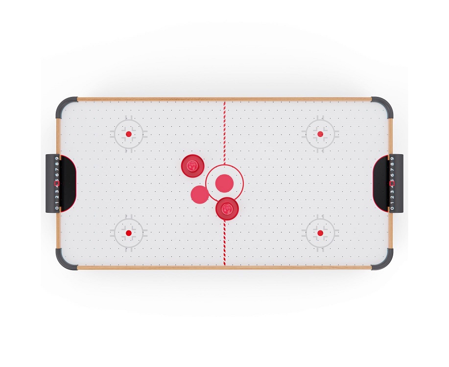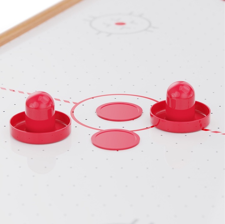 Игровой стол оснащён вентилятором на 220V, создающим воздушную подушку под шайбой. Это обеспечивает лёгкое и быстрое скольжение по полю, делая игру более захватывающей и реалистичной.