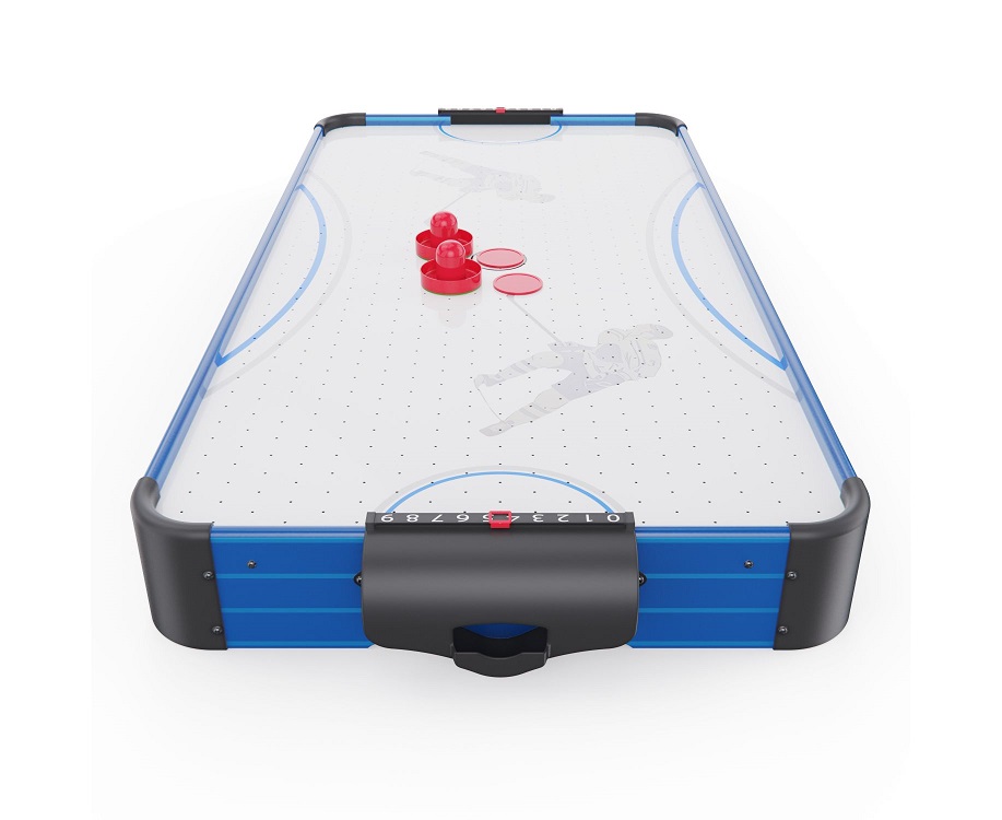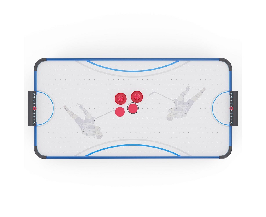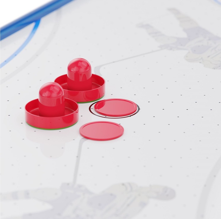Игровой стол оснащён вентилятором на 220V, создающим воздушную подушку под шайбой. Это обеспечивает лёгкое и быстрое скольжение по полю, делая игру более захватывающей и реалистичной.
