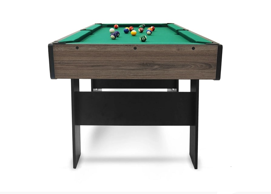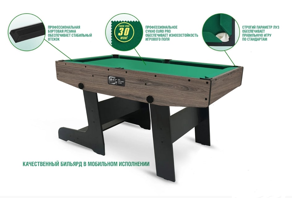 Еще одним преимуществом данной модели является удобный механизм складывания, позволяющий без особых усилий быстро сложить или разложить бильярдный стол. Благодаря складной конструкции опорных ножек, бильярдный стол при хранении занимает минимум пространства. Компактные размеры делают транспортировку и перемещение стола очень удобным.