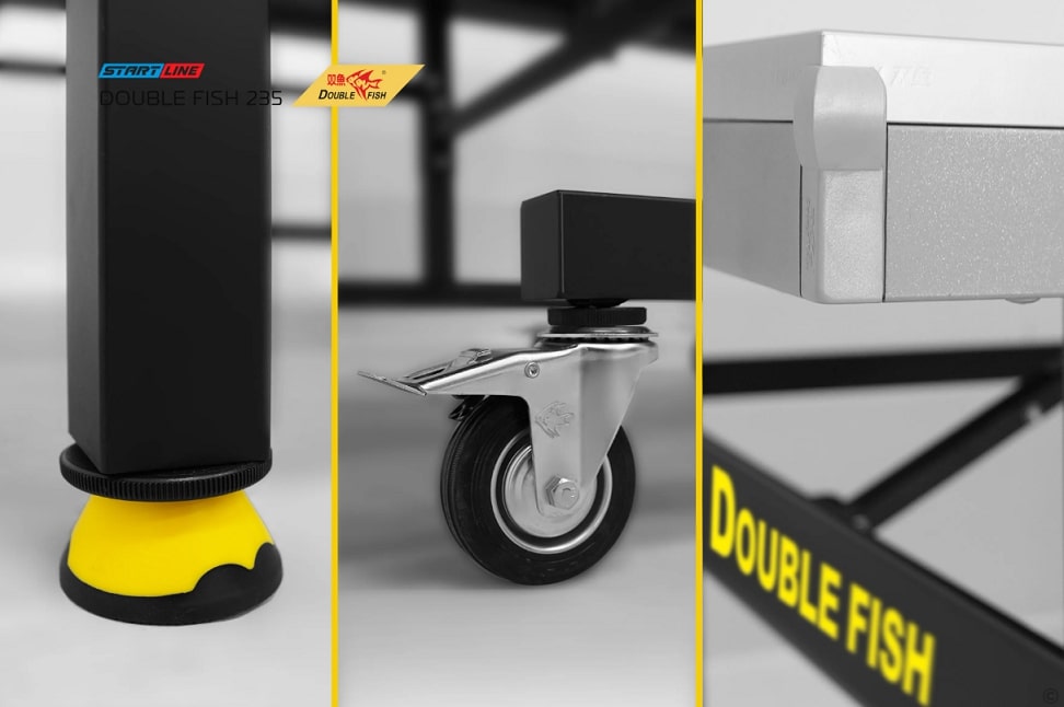 Теннисный стол Double Fish 235 не требует сборки. Модель поставляется в собранном виде, необходим только монтаж опор и транспортировочных колес.