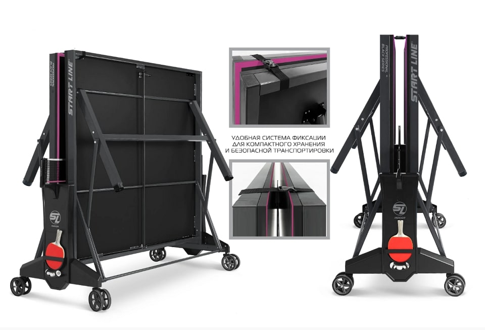 Комфортная система складывания стола является собственной авторской разработкой Start Line. Она предусматривает усовершенствованный механизм, позволяющий быстро и надежно закрепить положение стола как в разложенном, так и в сложенном виде. Все манипуляции производятся с рабочего места игрока для каждой из столешниц. С такой системой складывания легко справляется один человек, а стол при хранении занимает минимум пространства. Дополнительная фиксация стола в сложенном виде позволяет просто и безопасно транспортировать стол. Конструкцией предусмотрен режим одиночной игры PLAYBACK для самостоятельной проработки точности ударов.