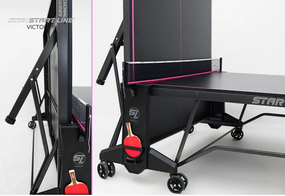 Модель Victory Black укомплектована удобным держателем для ракеток и мячей с покрытием Soft-touch и встроенной сеткой с натяжным механизмом, не требующей демонтажа при складывании. Начать игру можно в любое время, ведь все необходимое оборудование всегда под рукой.