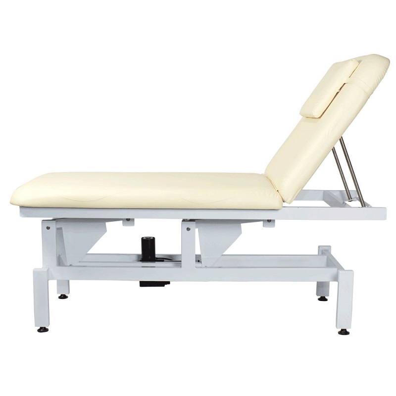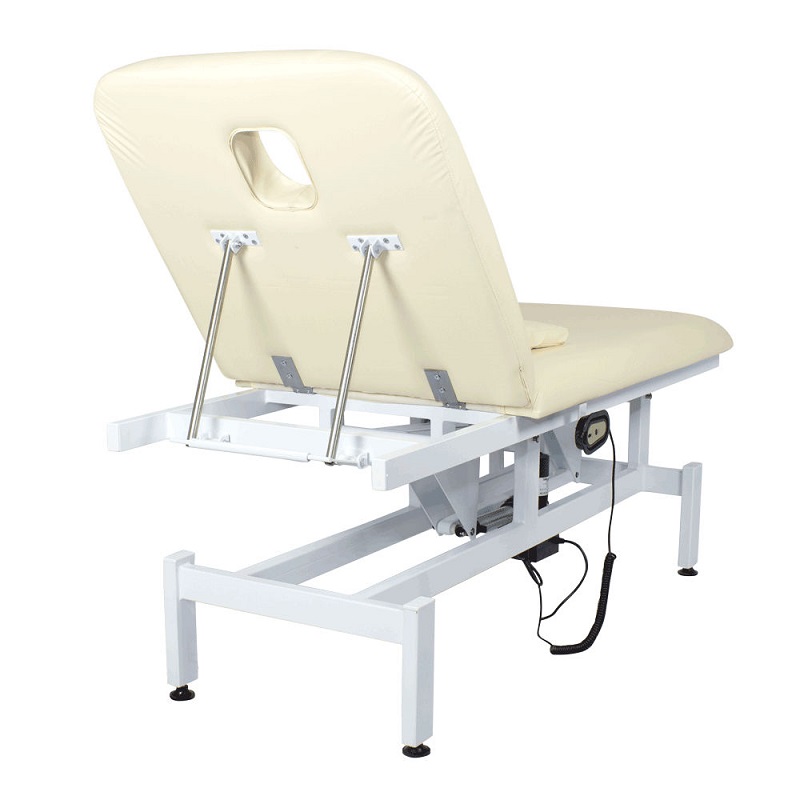 Комфортабельность кушетки обеспечивают мягкие элементы. Наличие поднимающейся спинки позволяет использовать ее для различных техник массажа. В спинке предусмотрено отверстие для лица, закрывающееся съемной подушкой–подголовником.