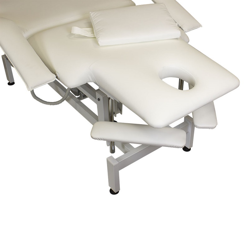Кушетка разделена на два мягких сегмента, положение которых регулируется. С помощью двух встроенных электромоторов можно дистанционно регулировать угол наклона спинки и высоту кушетки. В комплект поставки входит удобный пульт управления электроприводом. Каркас и основание из металла с защитным покрытием.