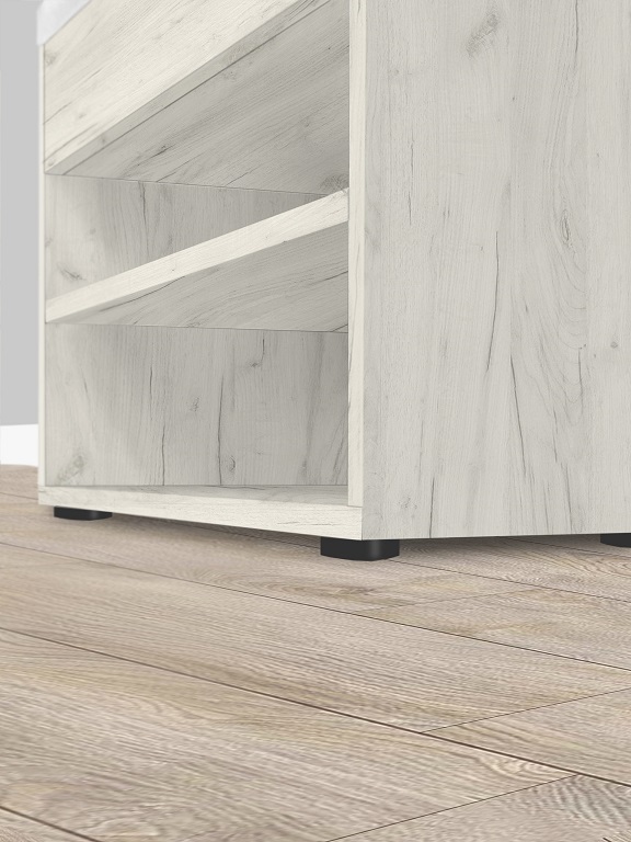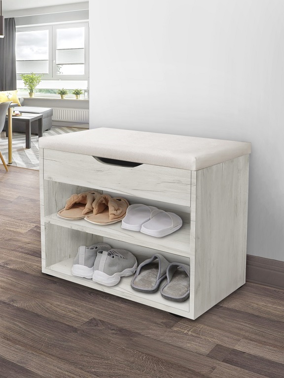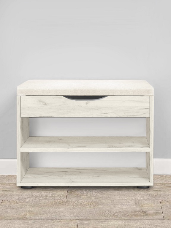 Кроме того, обувница “Этна” предлагает отличное решение для хранения обуви и повседневных вещей, ведь она оснащена двумя полками, на которых легко разместятся до 6 пар обуви, и мягким сиденьем из плотного пенополиуретана для комфортного переобувания. Под сиденьем находится просторный ящик с интегрированной ручкой для хранения мелочей. Основание обувницы выполнено из прочного ДСП и оснащено пластиковыми ножками для предотвращения возможного разбухания.