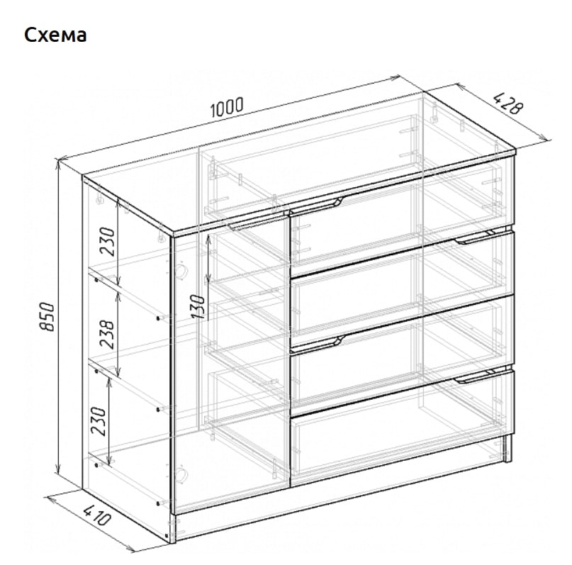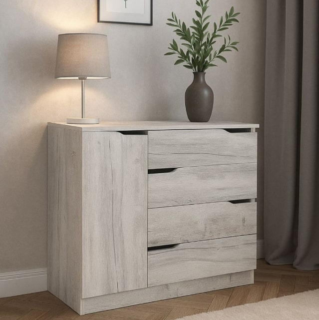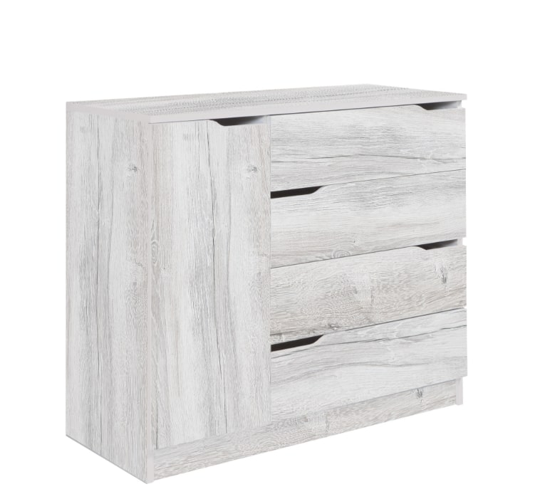 Комод Бремен - это комбинированная конструкция. 4 ящика и отделение с полкой за распашной дверцей позволяют удобно хранить бельё, носки или различные мелкие предметы.Минималистичный дизайн без выступающих элементов и фурнитуры впишется в интерьер спальни, прихожей или гостиной в современном стиле. Вместительный комод экономит пространство, не смотрится громоздко.
