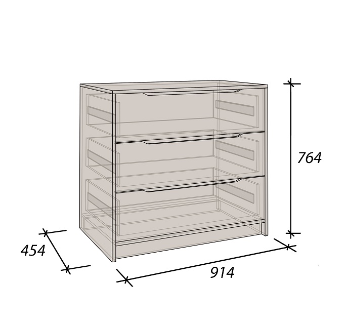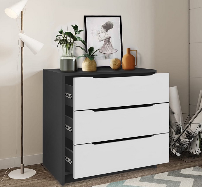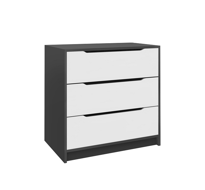 Компактный комод с интегрированными ручками отлично впишется в интерьер спальни или прихожей. Практичная и функциональная модель, отличающаяся простым и в то же время стильным дизайном. Имеет три больших выдвижных ящика. Изделие выполнено из ДСП темного и светлого оттенков.Данный комод идеально подойдет для размещения белья, сложенной одежды, аксессуаров и многого другого, а на широкой столешнице будут отлично смотреться рамки с фото и предметы декора.