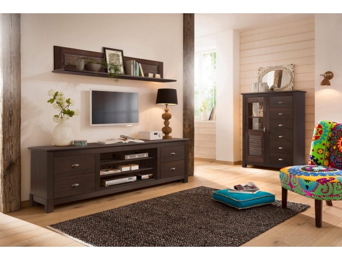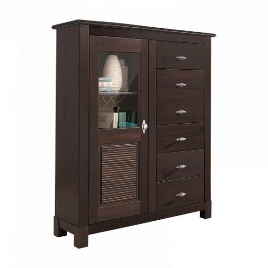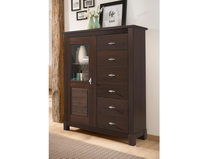 Высокий комод из натурального дерева. С левой стороны комода расположено отделение с двумя полками за распашной дверью, которое можно использовать как витрину. С правой стороны расположены шесть вместительных выдвижных ящиков для хранения нужных вещей. Выпускается в двух вариантах цвета.Коллекция Рауна выполнена в классическом минималистичном дизайне, который прекрасно впишется в любой интерьер. Представлена наборами мебели для прихожей, гостиной и спальни в белом цвете либо цвете колониал.