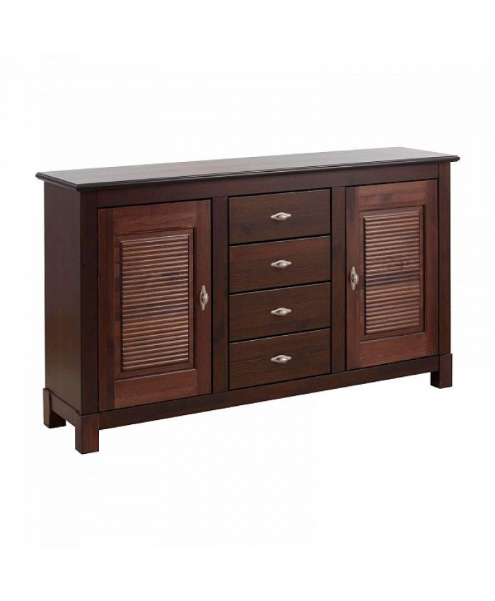 Широкий комод из натурального дерева. В центре комода расположено четыре выдвижных ящика на шариковых направляющих. По бокам отделения с полкой за глухими распашными дверями. Выпускается в двух вариантах цвета.Коллекция Рауна выполнена в классическом минималистичном дизайне, который прекрасно впишется в любой интерьер. Представлена наборами мебели для прихожей, гостиной и спальни в белом цвете либо цвете колониал.
