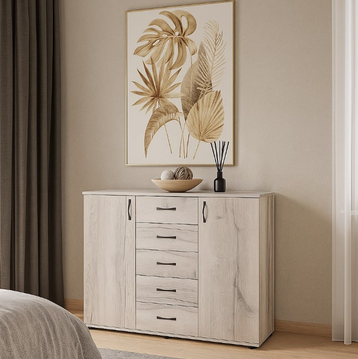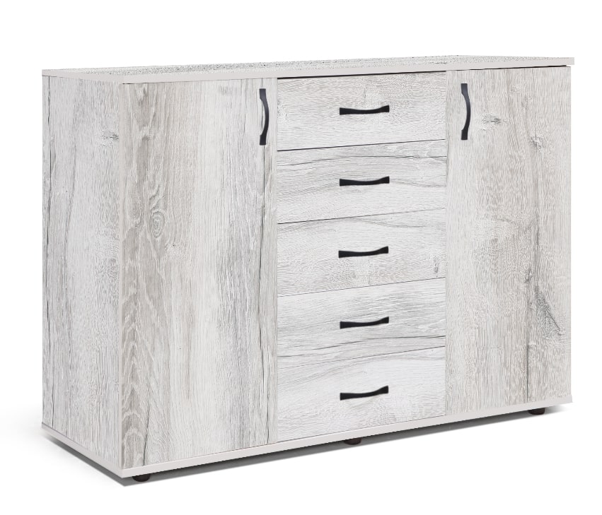 Комод Мюнхен - оригинальная модель в современном стиле. Удобная комбинированная конструкция комода повышает его функциональность и уровень комфорта в спальне, детской или прихожей.Пять вместительных выдвижных ящика комода расположены в центре, по бокам справа и слева - за распашной дверкой отделение с полкой. Универсальной сборки нет.