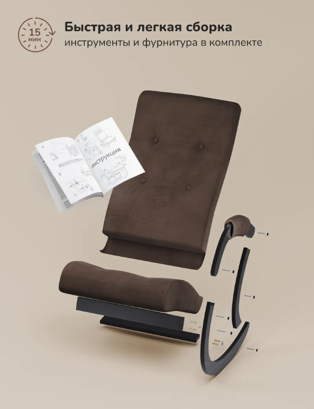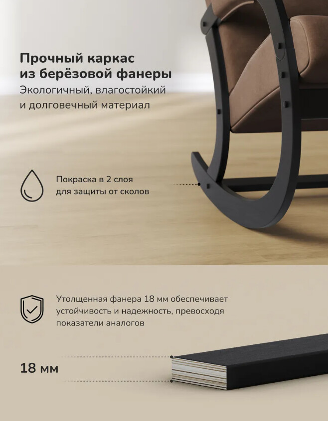 Кресло-качалка Аура — это идеальное место для отдыха и релаксации. Мягкие подлокотники упругое сиденье и анатомически правильная спинка поддерживают позвоночник и позволят вам удобно расположиться в кресле и наслаждаться покоем. Широкие полозья и оптимальный угол качания исключают опрокидывание.Каркас прочная берёзовая фанера толщиной 18 мм – гарантирует устойчивость и длительный срок службы