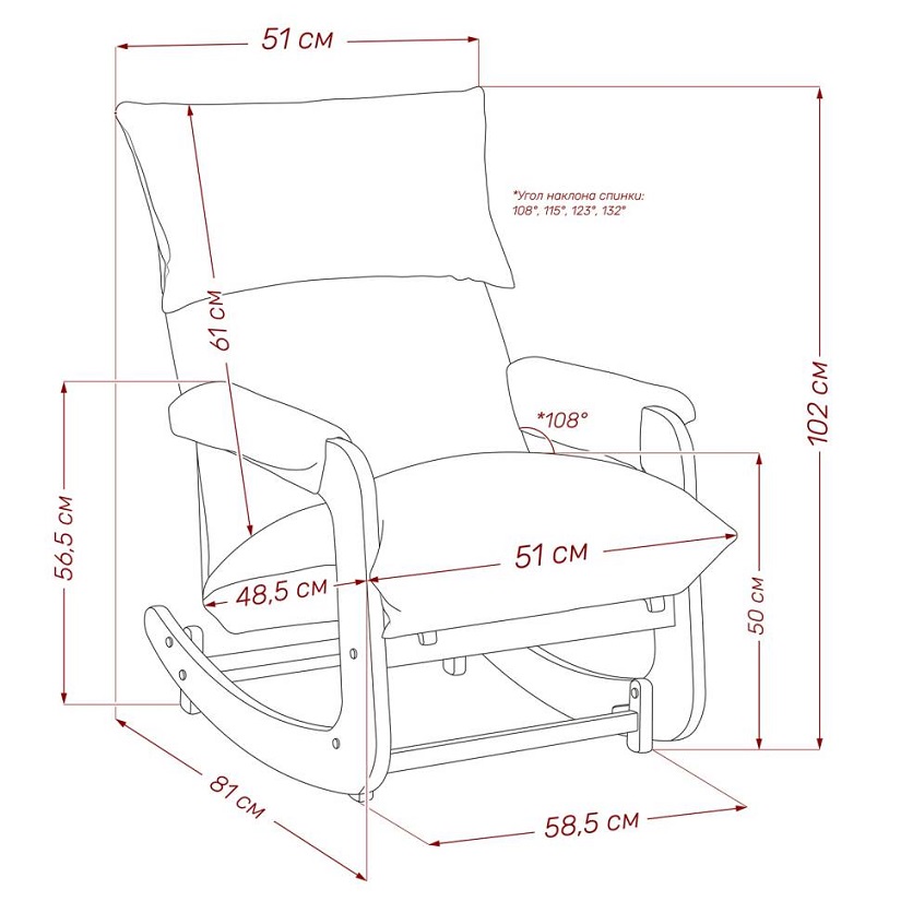 - Угол наклона спинки: 108°, 115°, 123°, 132°