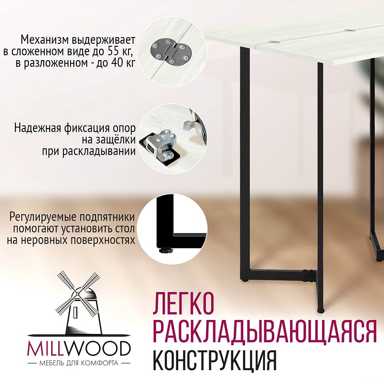 - в сложенном виде занимает минимум места, удобен для размещения у стены. В разложенном виде способен вместить множество гостей.