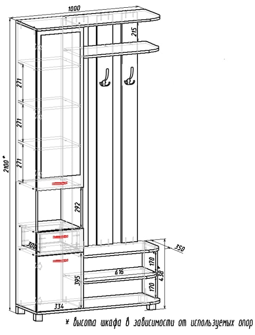- Габариты: 1000х350х2080 мм