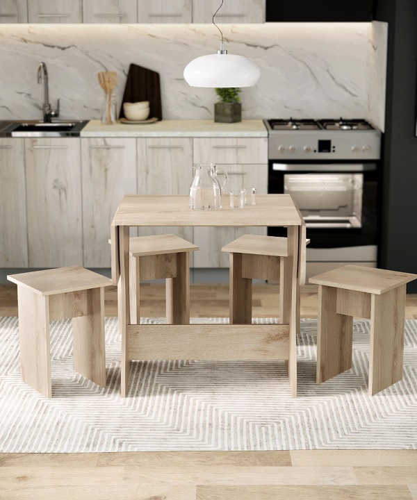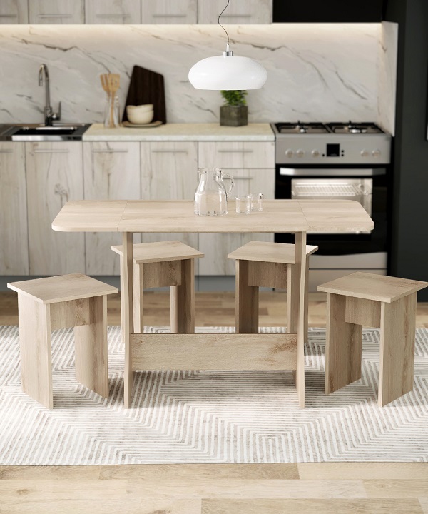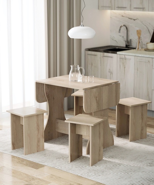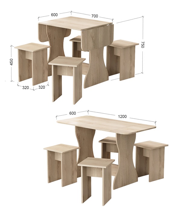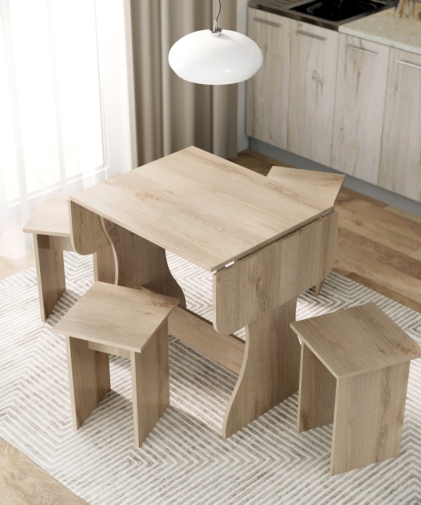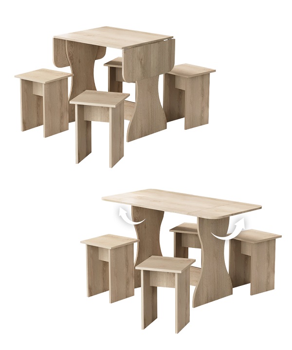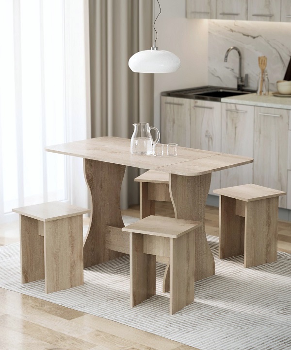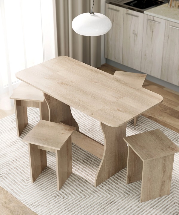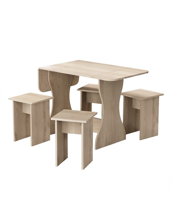 Корпус и столешница стола и стульев изготавливаются из распространенного и недорогого материала – ламинированного ДСП 16мм. Материал обладает повышенной устойчивостью к царапинам и повреждения. Края обработаны, под цвет корпуса. Скругленная форма боковин стола освобождает больше пространства вокруг стола. И вероятность что вы или ваши дети ударятся, намного ниже. Стол раздвигается двух сторон.