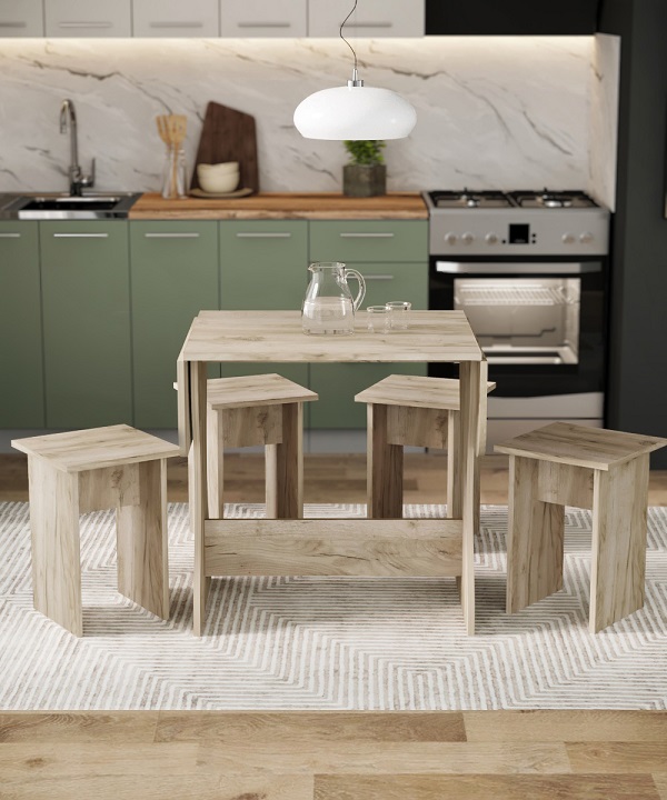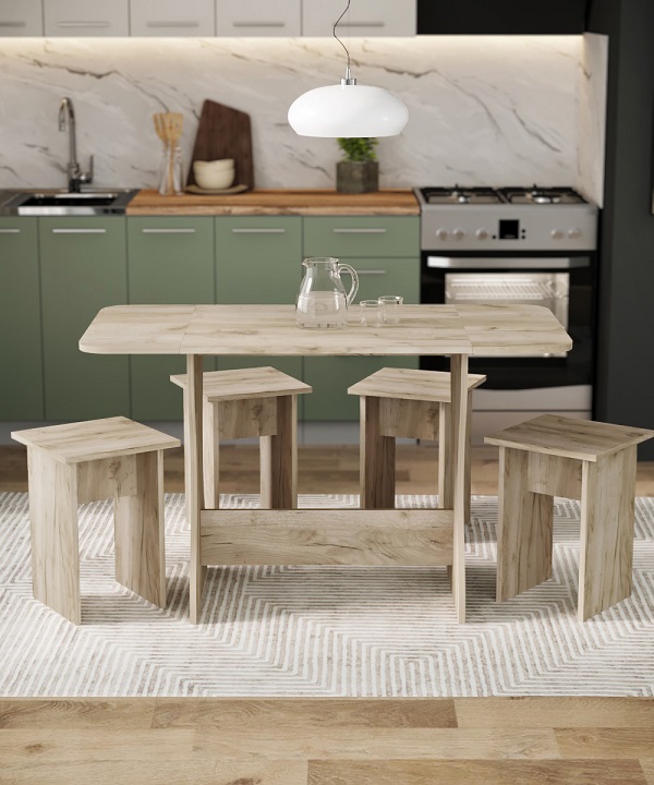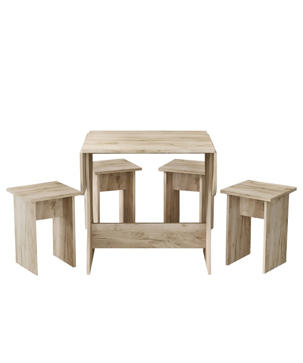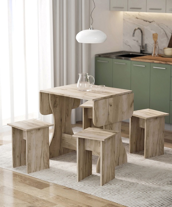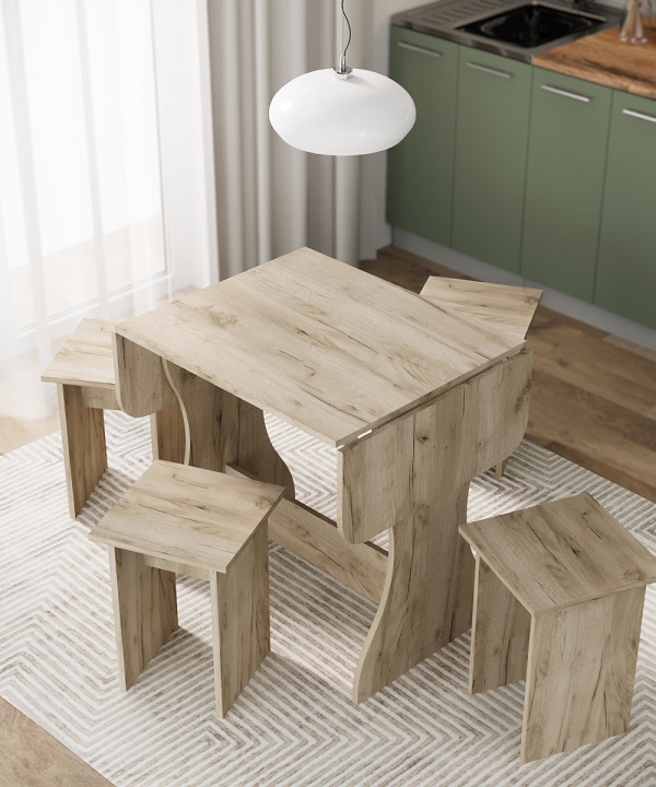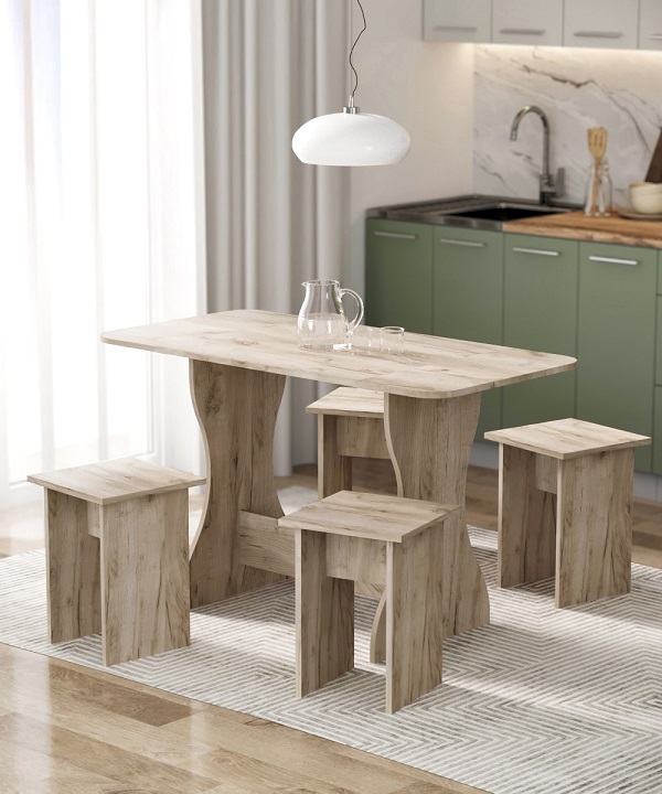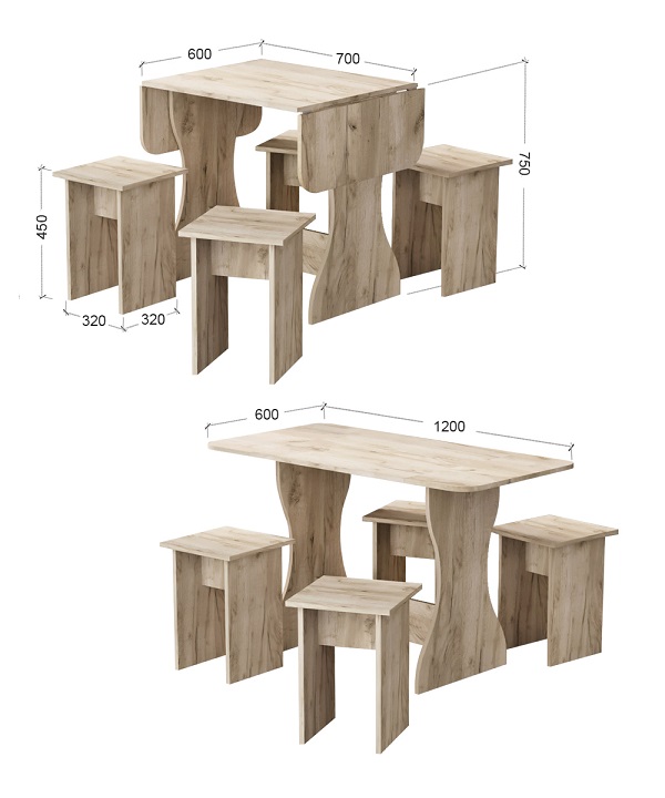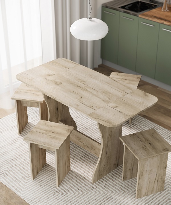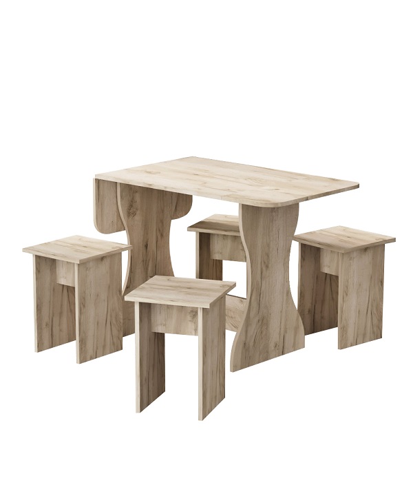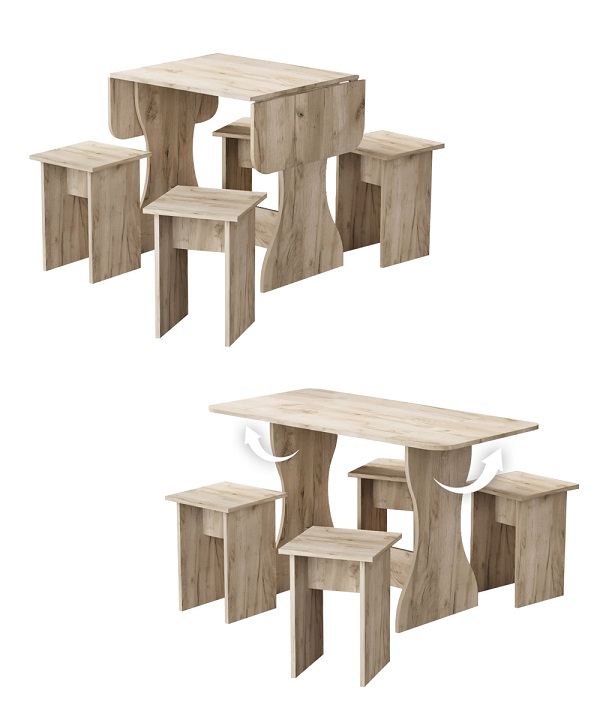 Корпус и столешница стола и стульев изготавливаются из распространенного и недорогого материала – ламинированного ДСП 16мм. Материал обладает повышенной устойчивостью к царапинам и повреждения. Края обработаны, под цвет корпуса. Скругленная форма боковин стола освобождает больше пространства вокруг стола. И вероятность что вы или ваши дети ударятся, намного ниже. Стол раздвигается двух сторон.При необходимости можно разложить только одну сторону. Несмотря на компактность, стол довольно вместительный в разложенном состоянии (ширина 1200мм). Вы можете рассадить как не большую компанию из 2-3 человек, так и с комфортом разместить до 7 родственников.
