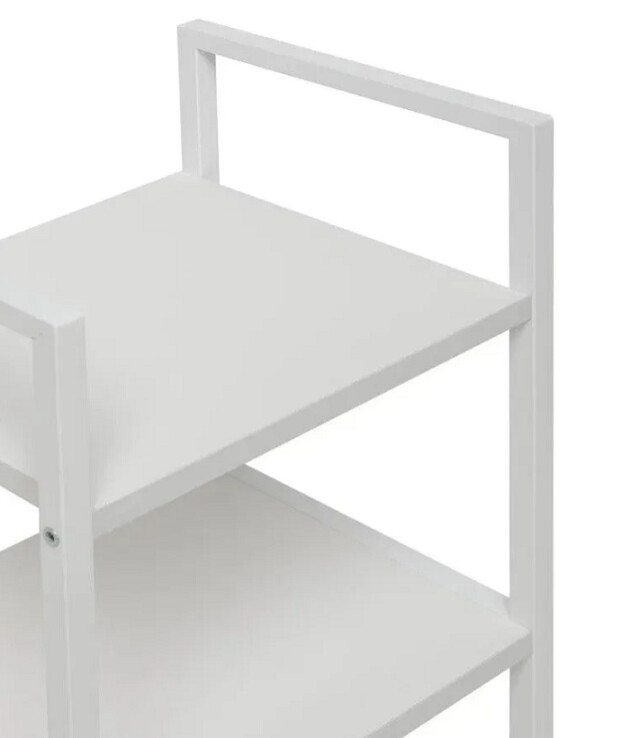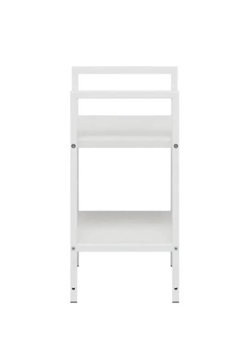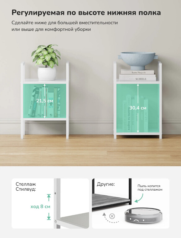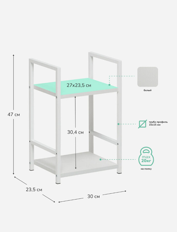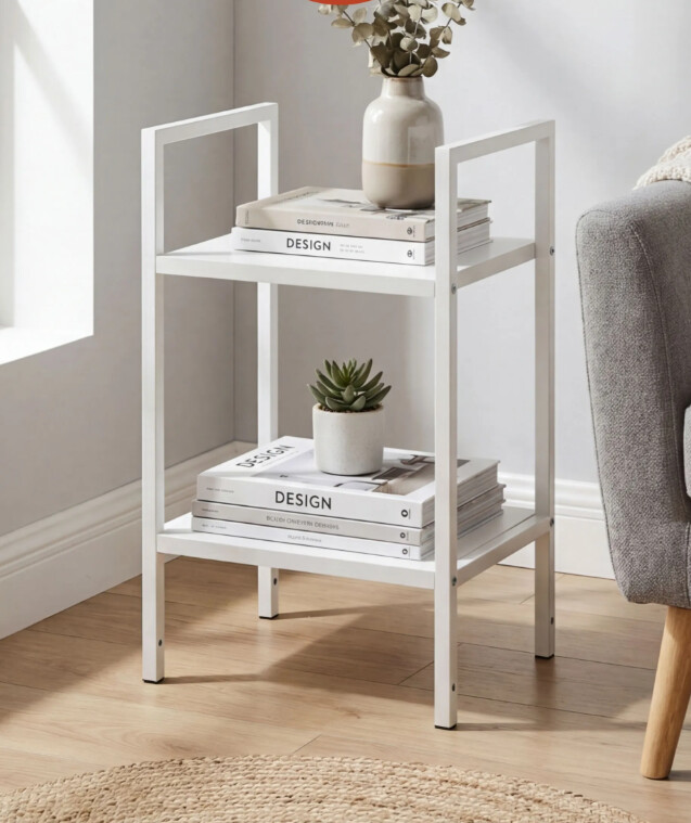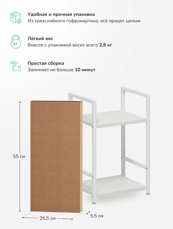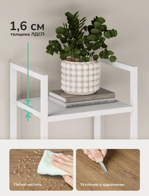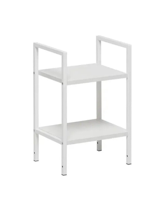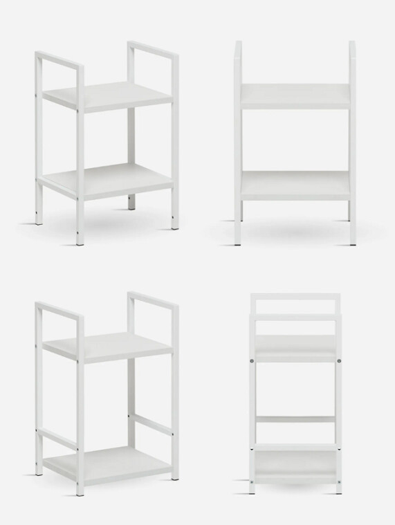 Этот двухъярусный стеллаж станет функциональным дополнением даже самых небольших помещений. Его компактные размеры позволяют разместить его в узком простенке прихожей для обуви, в спальне у кровати как прикроватную тумбу или на кухне для хранения специй и посуды.
