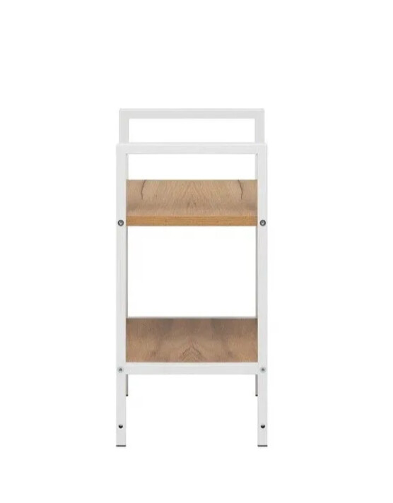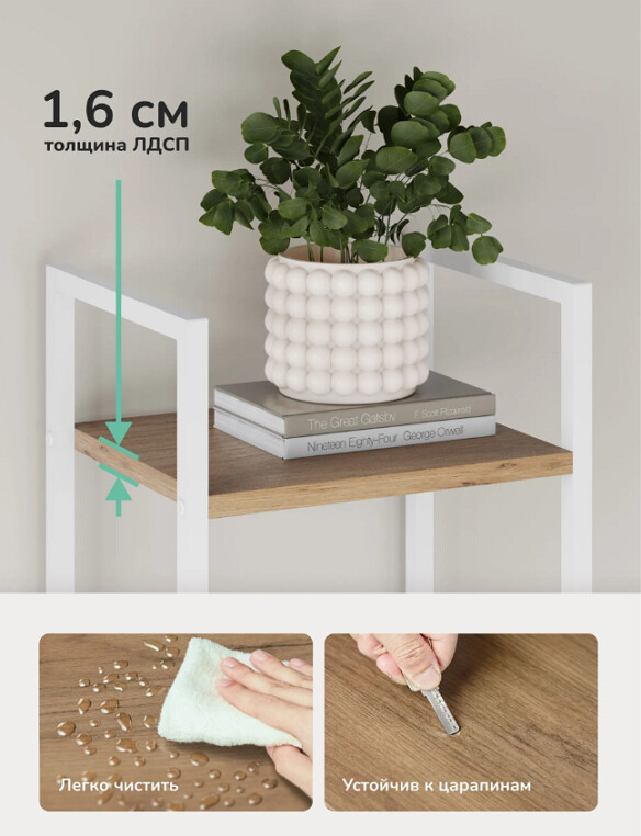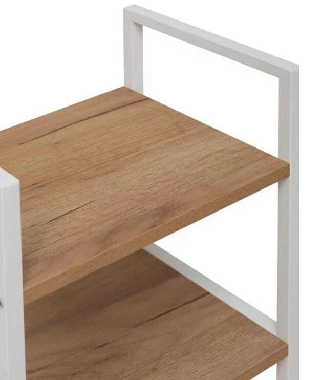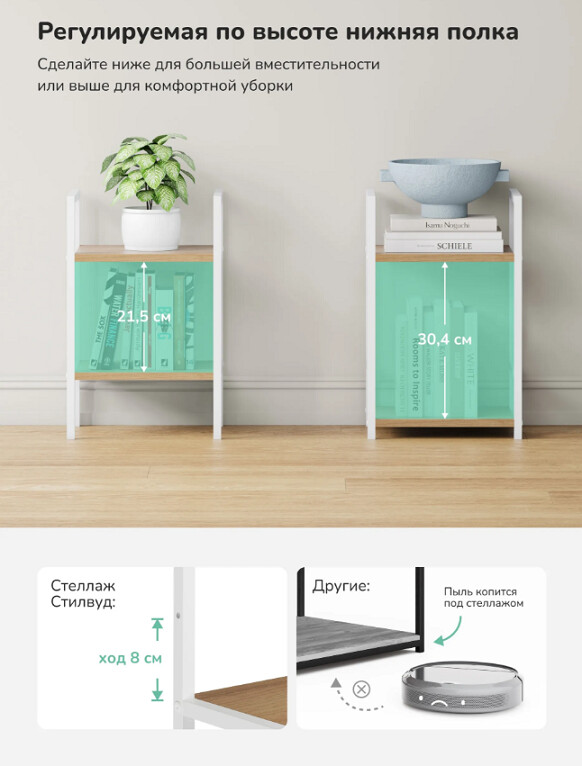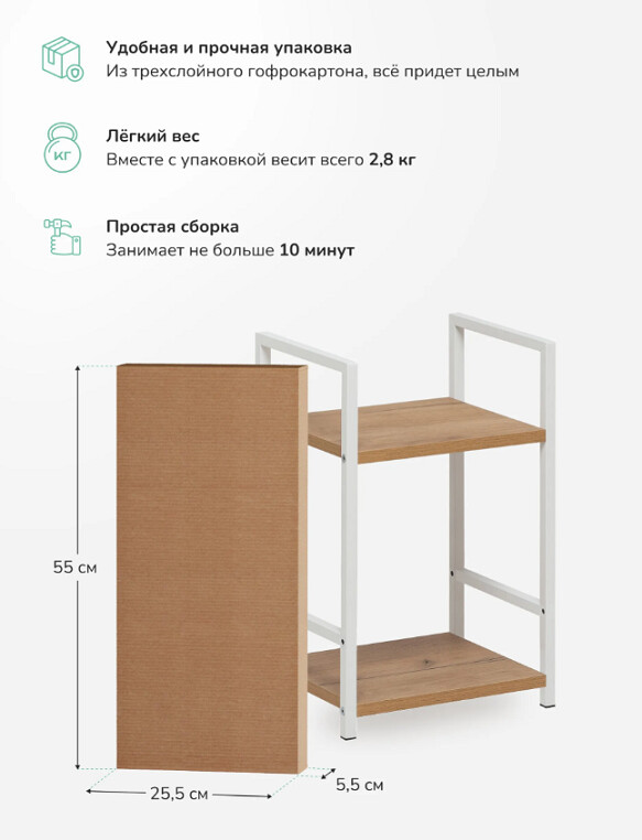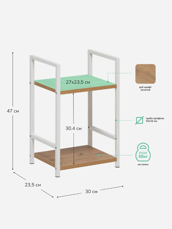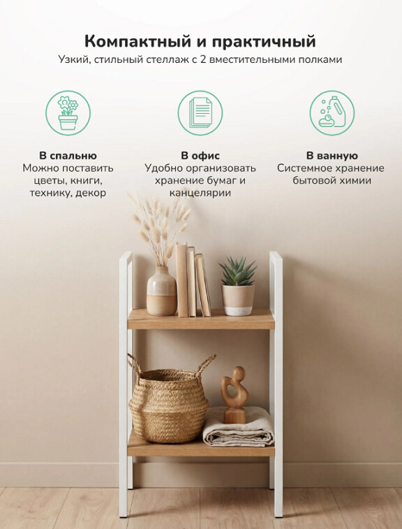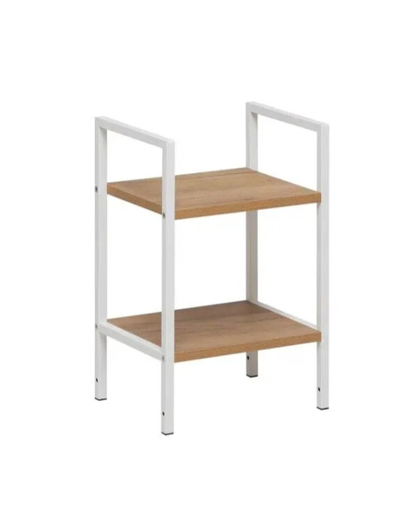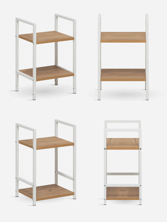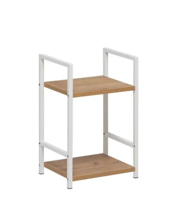 Этот двухъярусный стеллаж станет функциональным дополнением даже самых небольших помещений. Его компактные размеры позволяют разместить его в узком простенке прихожей для обуви, в спальне у кровати как прикроватную тумбу или на кухне для хранения специй и посуды.