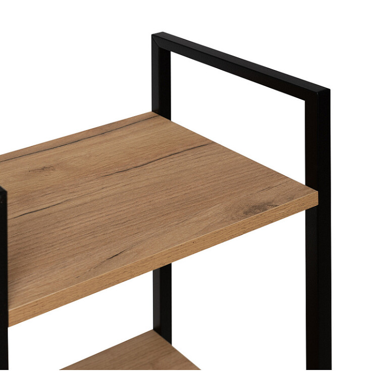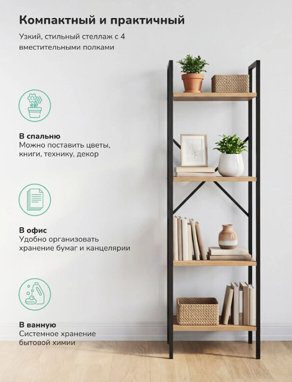 Этот стеллаж станет функциональным дополнением даже самых небольших помещений. Его компактные размеры позволяют разместить его в узком простенке прихожей для обуви, в спальне у кровати как прикроватную тумбу или на кухне для хранения специй и посуды.