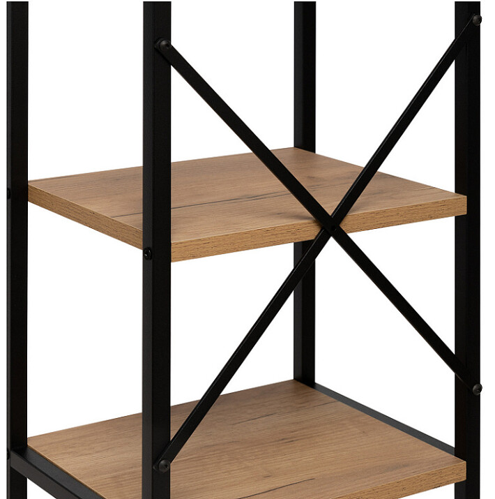 Напольный стеллаж Leset Стилвуд для хранения и организации вещей в прихожей, гостиной или на кухне, который помогает экономно использовать пространство и поддерживать порядок, а также выдерживать повседневные нагрузки.Каркас из металлического профиля 1.5 см, толщина 0.1 см с порошковым покрытием обеспечивает жёсткость и долговечность; крестовина жесткости и крепление к стене добавляют стабильности и безопасности. Полки из ЛДСП толщиной 1.6 см легко чистятся, устойчивы к царапинам и выдерживают до 20 кг каждая.