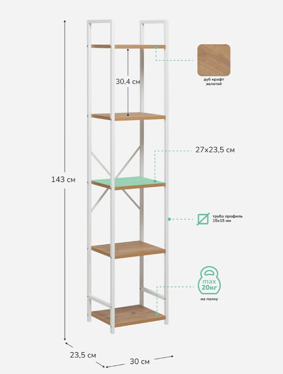 Напольный стеллаж Leset Стилвуд для хранения и организации вещей в прихожей, гостиной или на кухне, который помогает экономно использовать пространство и поддерживать порядок, а также выдерживать повседневные нагрузки.Каркас из металлического профиля 1.5 см, толщина 0.1 см с порошковым покрытием обеспечивает жёсткость и долговечность; крестовина жесткости и крепление к стене добавляют стабильности и безопасности. Полки из ЛДСП толщиной 1.6 см легко чистятся, устойчивы к царапинам и выдерживают до 20 кг каждая.