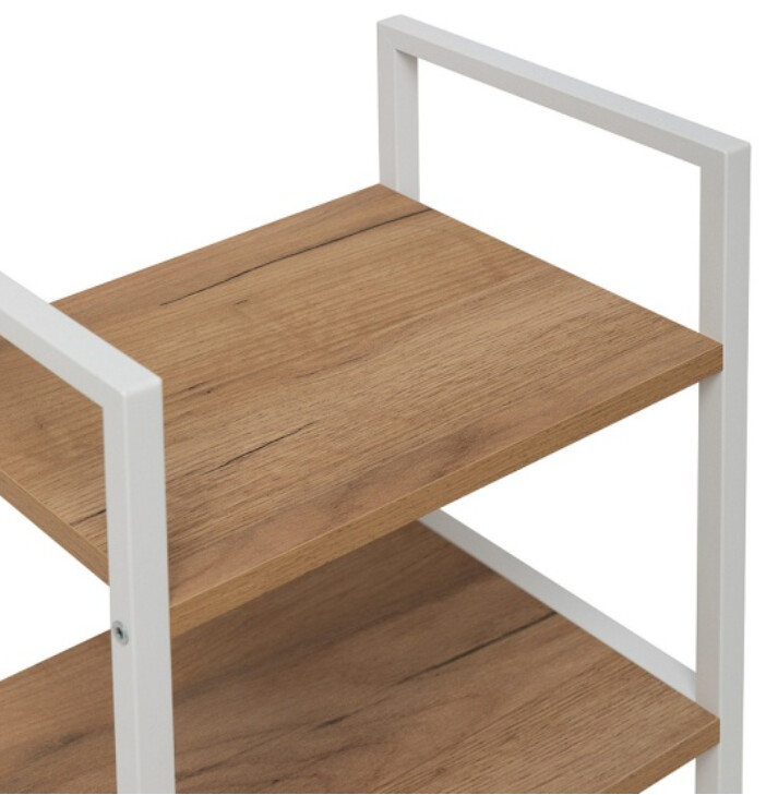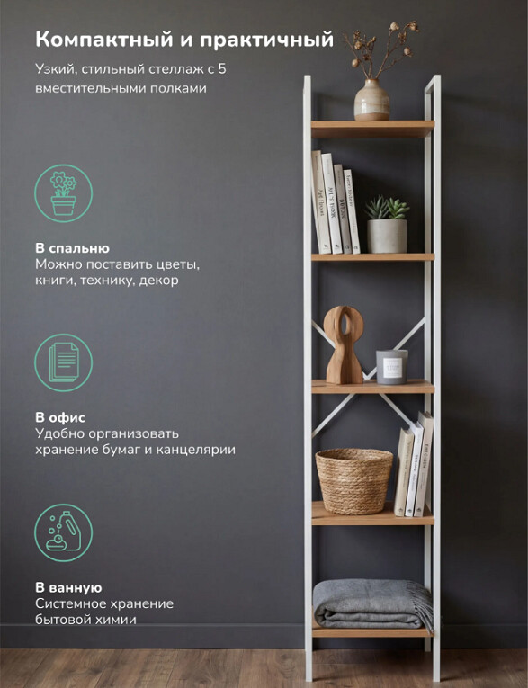 Этот стеллаж станет функциональным дополнением даже самых небольших помещений. Его компактные размеры позволяют разместить его в узком простенке прихожей для обуви, в спальне у кровати как прикроватную тумбу или на кухне для хранения специй и посуды.