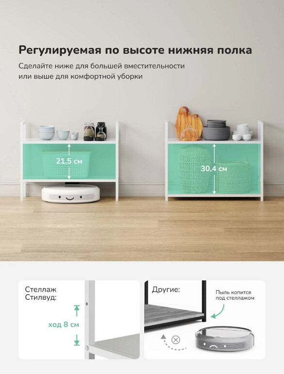 Нижняя полка регулируется по высоте (ход 8 см), гибкая организация пространства под разные предметы.