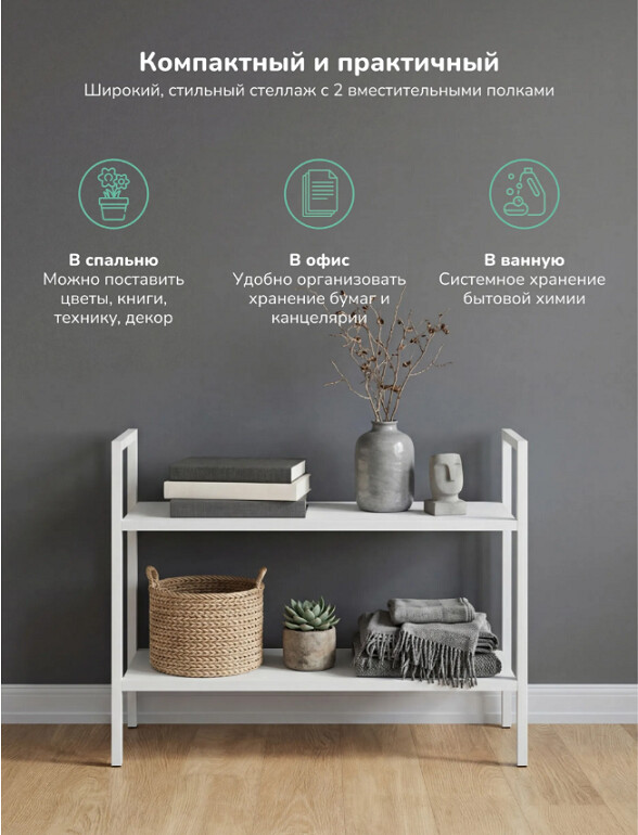 Стеллаж идеален для малогабаритных квартир, студий и офисных пространств. Благодаря строгим линиям и белому цвету, он впишется как в минималистичный интерьер, так и в лофт или скандинавский стиль. Подойдет для хранения книг, комнатных растений, декоративных элементов или коллекционных моделей.