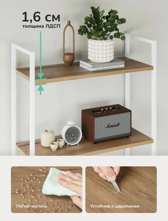 Полки ЛДСП 16 мм, прочные, устойчивы к царапинам и легко очищаются.