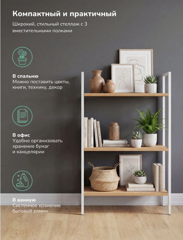 Стеллаж идеален для малогабаритных квартир, студий и офисных пространств. Благодаря строгим линиям и белому цвету, он впишется как в минималистичный интерьер, так и в лофт или скандинавский стиль. Подойдет для хранения книг, комнатных растений, декоративных элементов или коллекционных моделей.