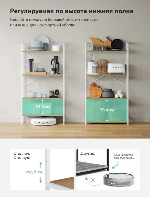 Нижняя полка регулируется по высоте (ход 8 см), гибкая организация пространства под разные предметы.