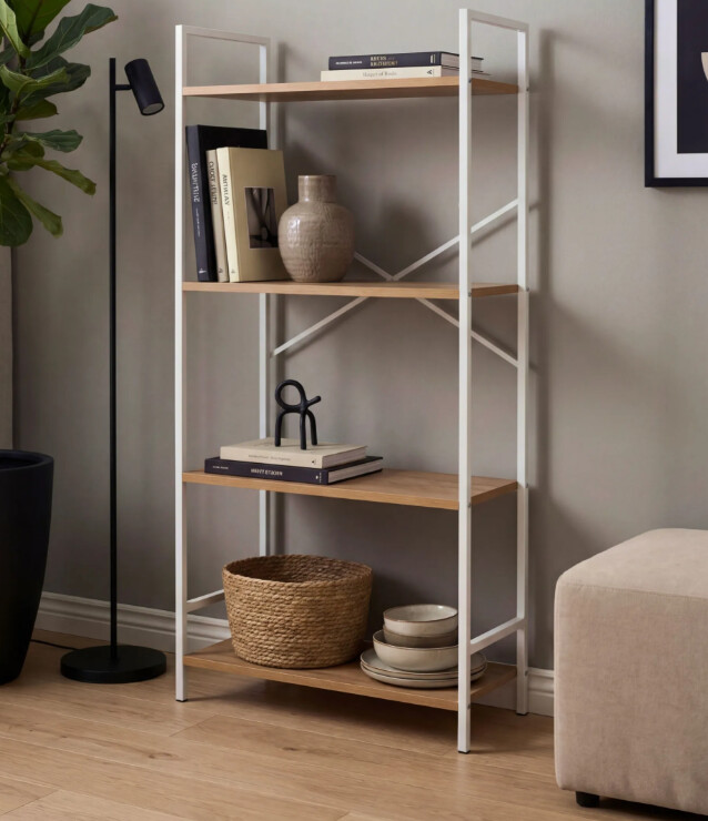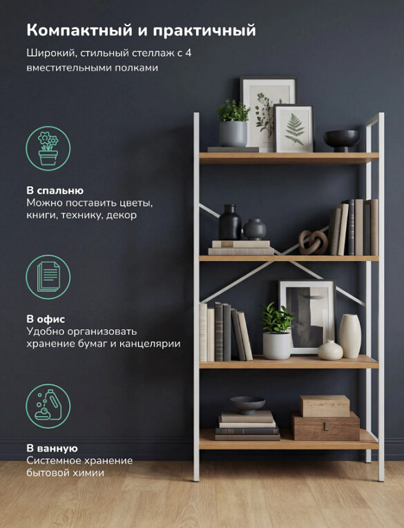 Стеллаж идеален для малогабаритных квартир, студий и офисных пространств. Благодаря строгим линиям и белому цвету, он впишется как в минималистичный интерьер, так и в лофт или скандинавский стиль. Подойдет для хранения книг, комнатных растений, декоративных элементов или коллекционных моделей.